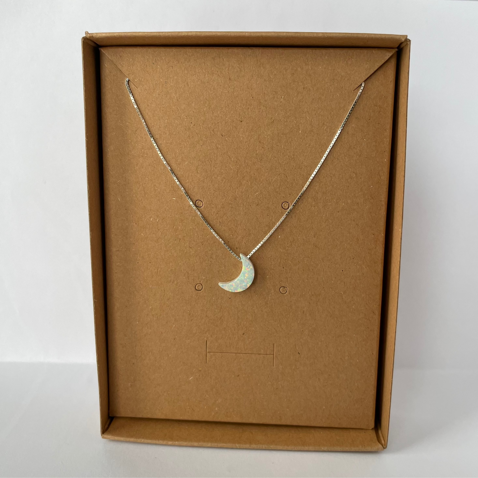 This crescent moonstone necklaces has some green and blues hues perfect for a gift for anyone. Make with sterling silver 8.5 inches long.